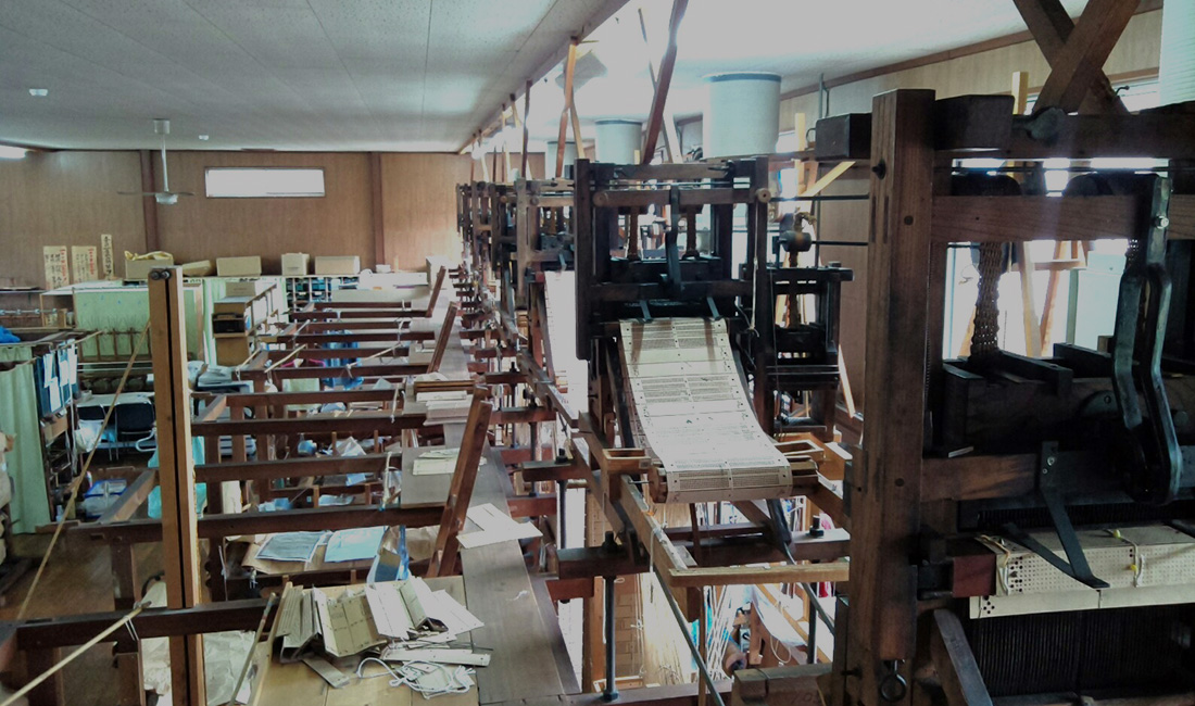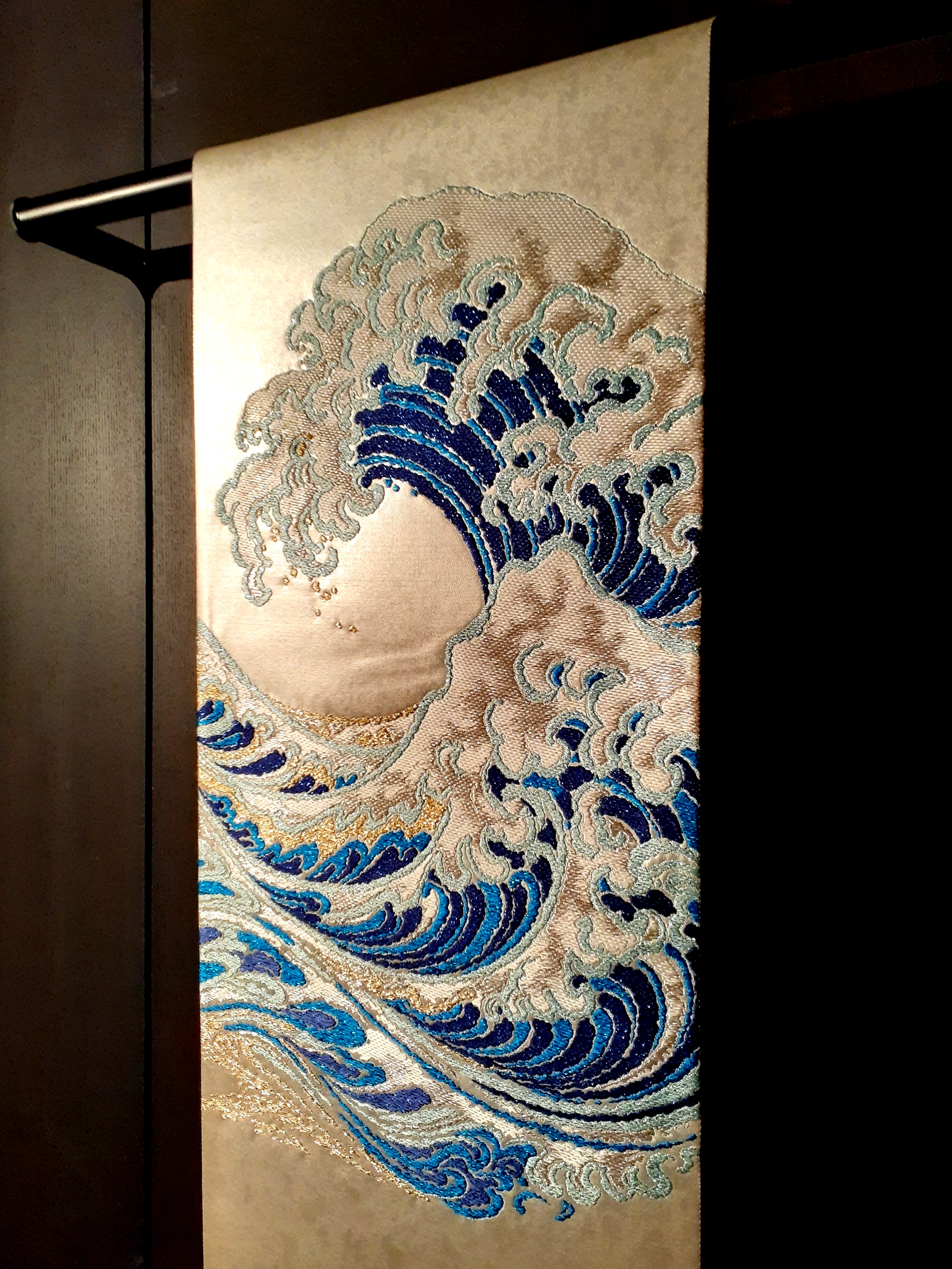 一般的な絹糸(四眠蚕)の半分程の太さの三眠蚕糸を用い、その生地は軽くて、しなやかな風合いが特徴です。 経糸に三眠蚕を使用し、引箔にて織り上げた逸品です。